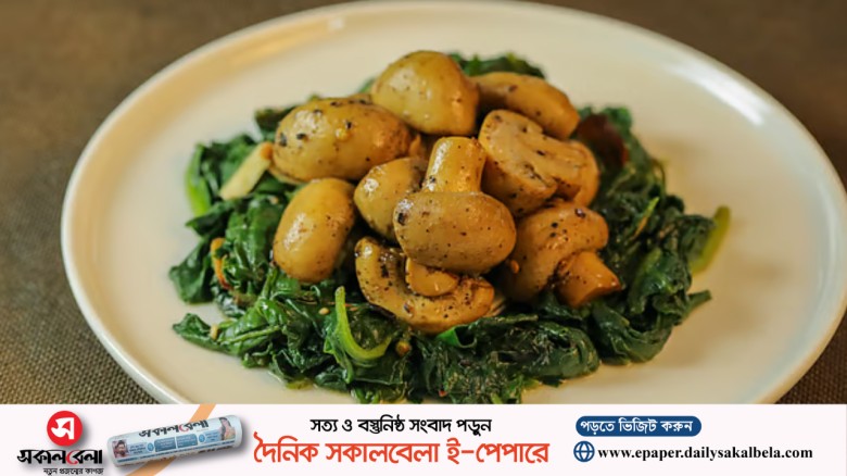 ক্যানেড মাশরুম ও পালংশাক দিয়ে তৈরি একটি চটজলদি রেসিপি; প্রথমে রসুন, মরিচ গুঁড়া ও গোলমরিচ দিয়ে মাশরুম ভেজে তুলে রাখা হয় এবং এরপর একই প্যানে পালংশাক ভেজে দুটো একসঙ্গে সাজিয়ে পরিবেশন করা হয়।...…
